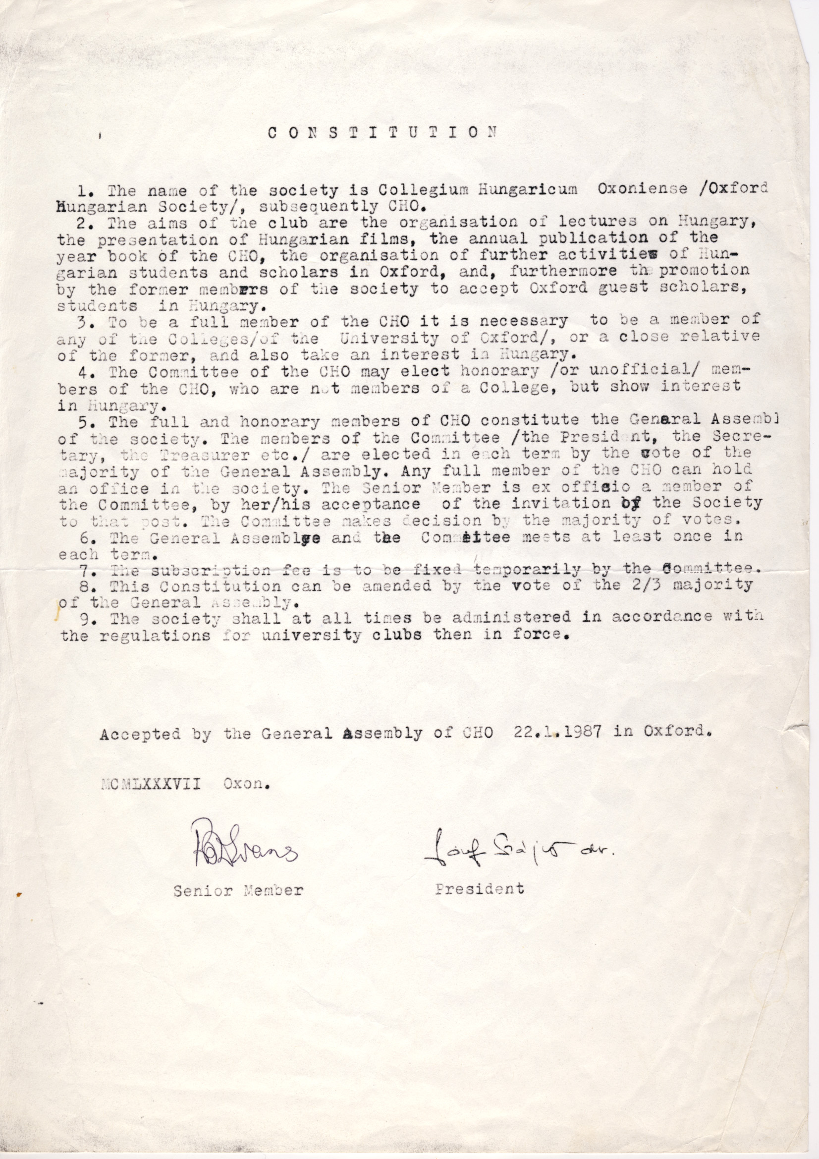 1. The name of the society is Collegium Hungaricum Oxoniese/Oxford Hungarian Society/, subsequently CHO.